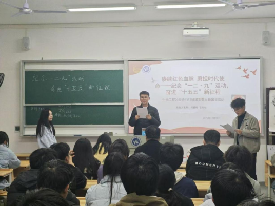 活动在“红色青春”宣讲团成员宋扬同学的宣讲中拉开序幕。她围绕二十届四中全会精神,结合青年责任与时代使命,号召同学们勇担重任,争做新时代的建设者。随后,团支部书记围绕“一二·九”精神的时代内涵、“十五五”规划的核心目标以及青年一代的使命担当等内容展开讲解。全体成员共同观看专题视频,重温“一二·九”运动的光辉历史,感悟爱国主义精神的深刻内涵。在研讨交流环节,设置了党史知识竞答。现场同学踊跃参与,在互动中进一步加深对“一二·九”精神的理解,筑牢理想信念根基。活动最后,在场师生齐声诵读了《清华大学救国会告全国民众书》。铿锵有力的诵读声中,传递出青年一代的昂扬斗志与责任担当,彰显了赓续红色血脉、矢志奋斗报国的坚定决心。