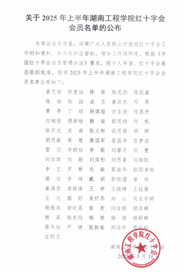 上一篇: 2025年第二批次湖南工程学院红十字会会员名单公示